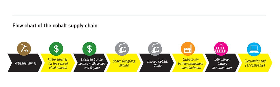 Výskumná správa “Pre toto zomierame: Porušenia ľudských práv v Konžskej demokratickej republike poháňajú svetový obchod s kobaltom”, sleduje obchod s kobaltom používaný v lithium-ionových batériách od jeho získavania z baní, v ktorých v nebezpečných podmienkach pracujú spolu s dospelými deti už vo veku 7 rokov.