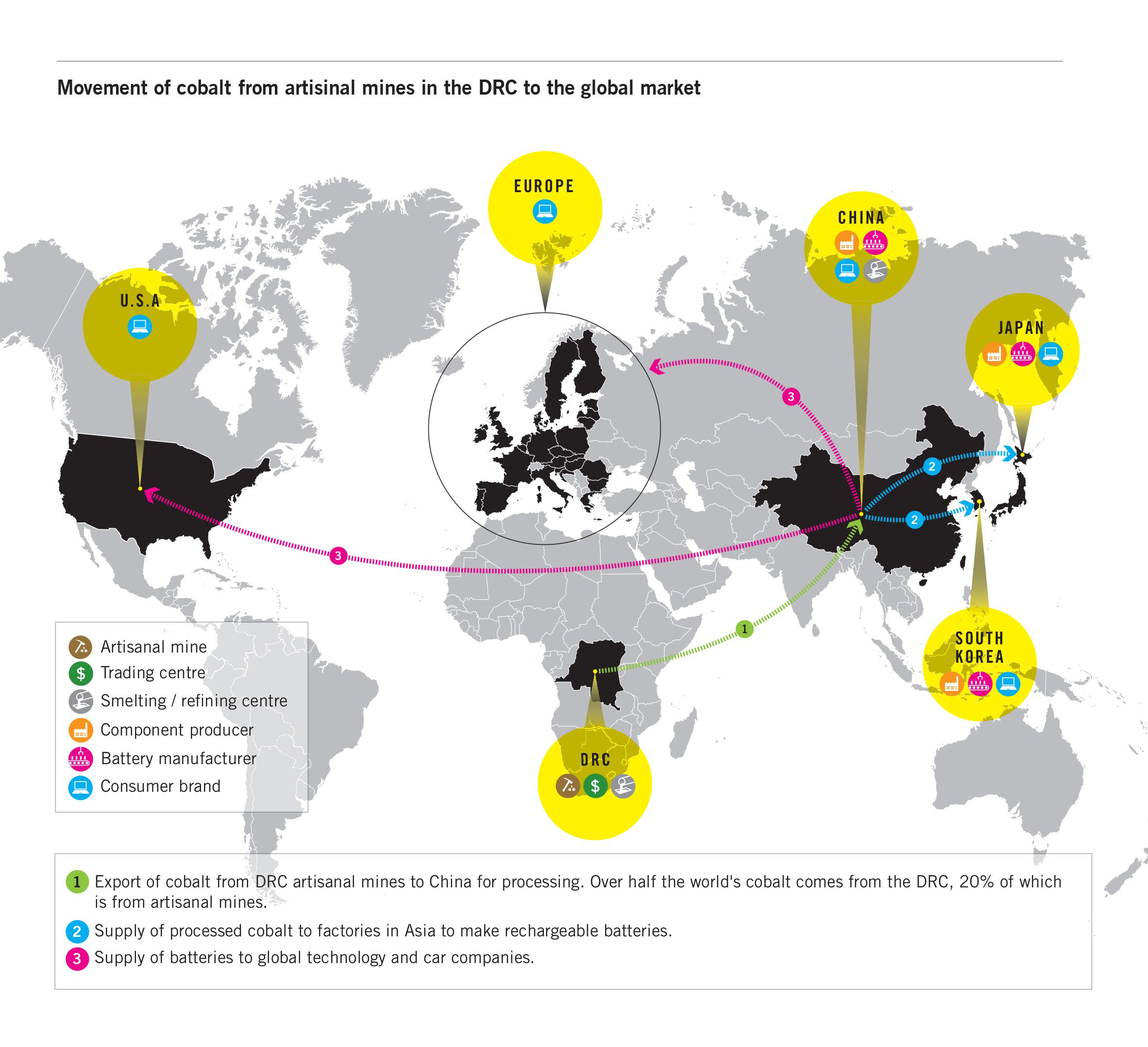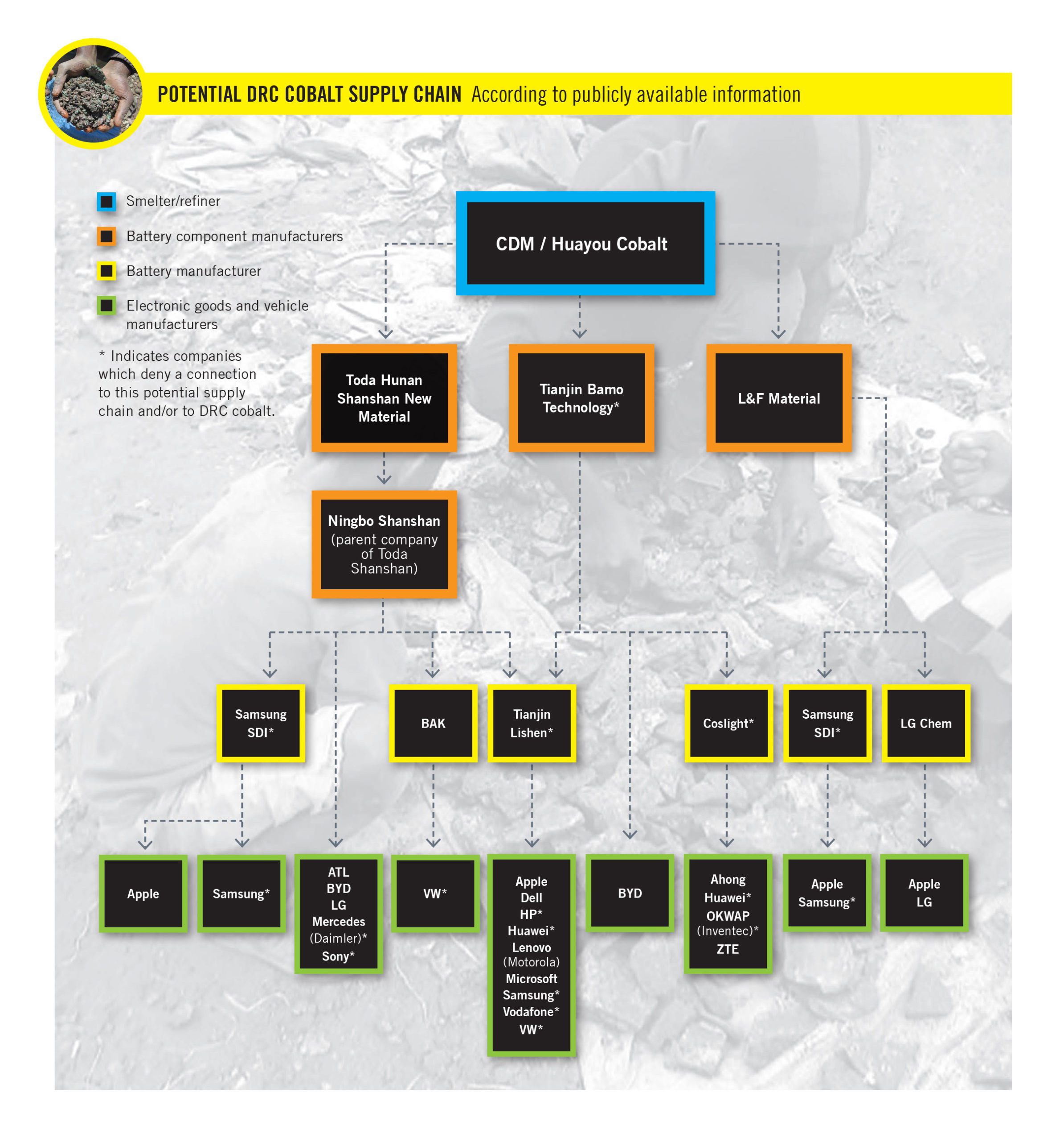 Výskum Amnesty International sa odvoláva na dokumenty investorov, vďaka ktorým ukazuje na to ako Huayou Cobalt a dcérska spoločnosť CDM procesujú kobalt predtým ako ho predávajú trom výrobcom komponentov batérií v Číne a v Južnej Kórei. Následne ich tieto spoločnosti predávajú výrobcom batérií, ktorí tvrdia že zásobujú technologické a automobilové spoločnosti vrátane Apple, Microsoft, Samsung, Sony, Daimler a Volkswagen.